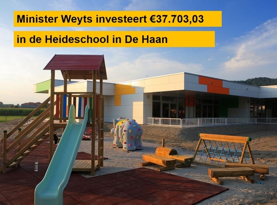 Vlaams minister van Onderwijs Ben Weyts (N-VA) investeert 37.703,03 euro in de gebouwen van de Heideschool in De Haan. Vlaanderen investeert deze regeerperiode een half miljard extra in schoolinfrastructuur. Die investeringsgolf zal dus ook in De Haan voelbaar zijn.